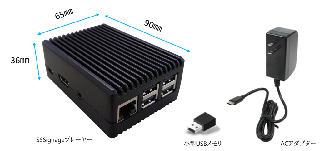 9cm(縦) × 6.5cm(横) × 3.6cm(高さ) で手の平サイズのコンパクトなサイネージプレーヤーで、あらゆる場所に配置可能です。