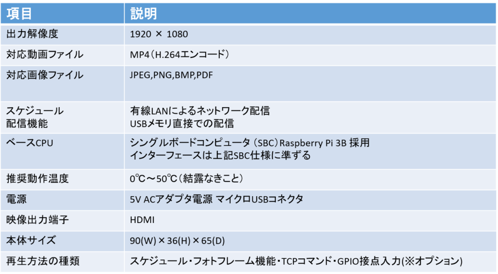 Raspberry Piベースの高機能SBC(シングルボードコンピュータ)を採用し、堅牢性と安定性を両立しつつ、1920×1080のフルHD出力にも対応。コンピュータ内部の動作もデジタルサイネージ専用に設計・製作されています。