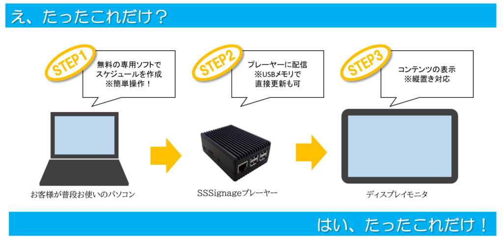 プレーヤー本体「SSSignageプレーヤー」と専用ソフト「SSSignageマネージャー」のセットで、手にしたその日から本格的なデジタルサイネージを体験する事ができます。